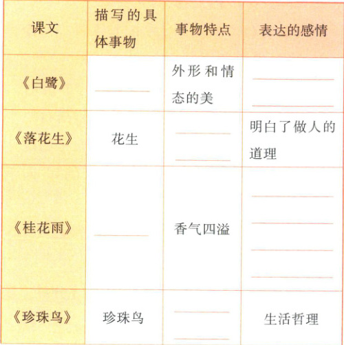 一、白鹭 喜爱和赞美 外表不好看,但有用 桂花 思念家乡和亲人,怀念童年生活 从怕人到信赖人