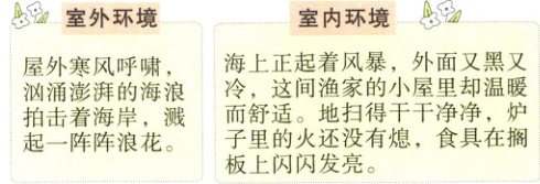 和屋内的不同环境。对自然环境的描写说明了渔夫外出打鱼的危险,也反映出渔夫一家人生活的艰辛、贫困