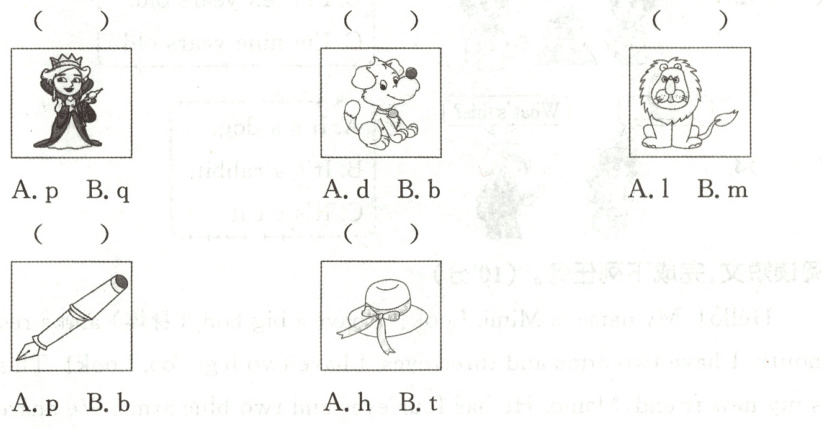 一、听录音,圈出你所听到的单词的首字母并给下列图片排序。(10分)