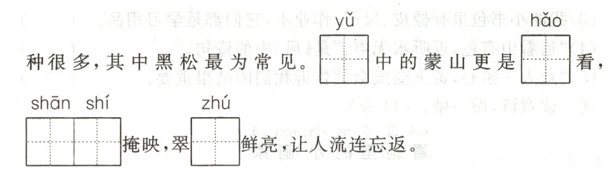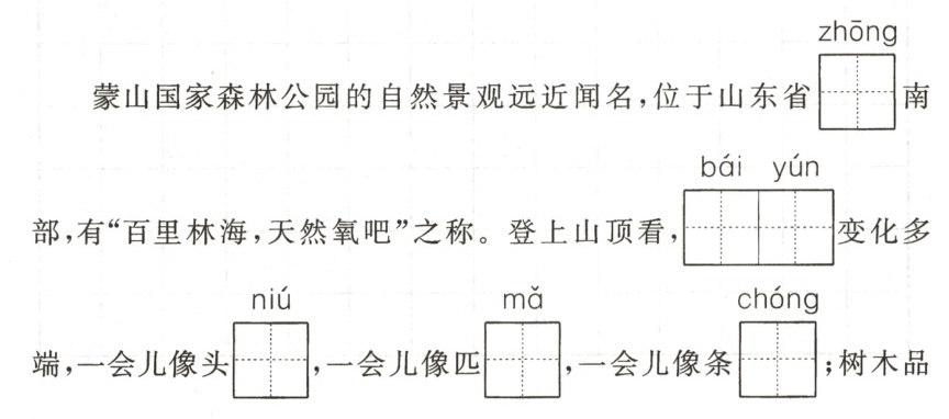 三、1.中 白云 牛 马 虫 雨 好 山石 竹