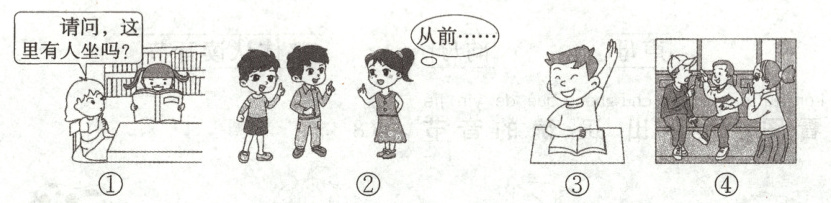 观察下面的图片,在这些情景中,需要小声说话的是( )和( ),需要大声说话的是( )和( )。(填序号)