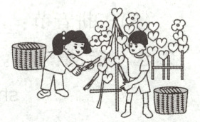 在果园里,小明和小红正在摘苹果(心形图案代表果树上的果实)。小明拿着篮子,小红正在把摘下的苹果递给小明。他们会说: