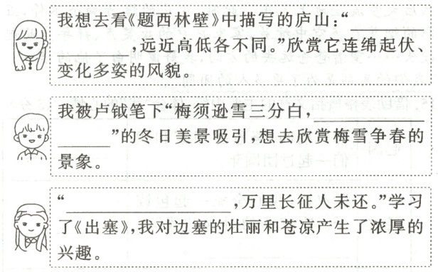 7. 同学们分享了自己的出行计划,请你一起参与讨论,把诗句补充完整。(6分)