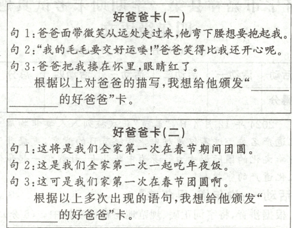 )17. 文中的爸爸一定给你留下了深刻的印象,根据下面的提示为他设计两张“好爸爸卡”。(4分)