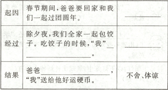 )(3)“我”给爸爸好运硬币的原因是:希望守卫边境的爸爸也能有好运气,表现“我”对爸爸的爱。(