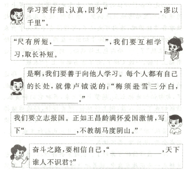 6.差之毫厘 寸有所长 雪却输梅一段香 但使龙城飞将在 莫愁前路无知己 7.示例:只见小乐蹦蹦跳跳地上台领取奖品,又蹦蹦跳跳地跑回座位,兴奋地挥舞着奖品,向周围的同学展示自己的战利品。