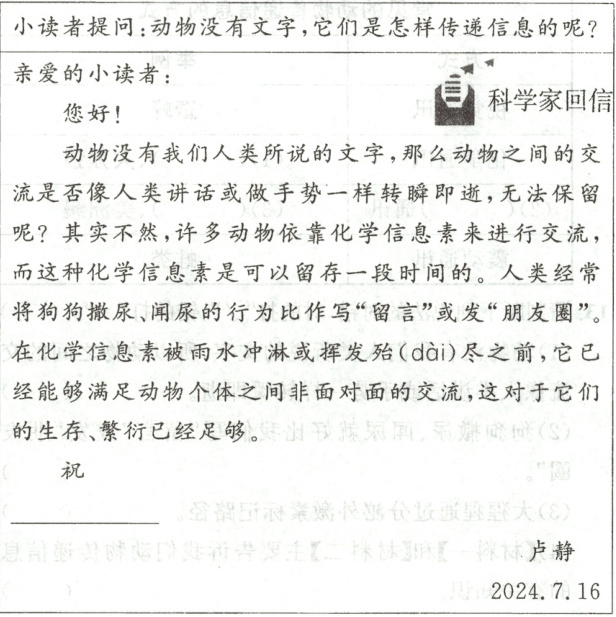 (4)√ 14.示例:通过阅读两则材料中动物传递信息的方式,对你有什么样的启发?从材料中得到启示的角度来提问的。