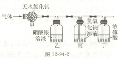某塑料含有碳、氢元素,可能还含有氧和氯元素中的一种或两种。该塑料充分燃烧除生成二氧化碳和水蒸气外,还可能生成氯化氢气体。取 $m$ g 该塑料样品与足量干燥的氧气充分反应,用图 12-94-2 所示装置吸收生成的气体。实验过程中,观察到装置乙溶液中产生白色沉淀。当气体被充分吸收后,测得装置甲、乙、丙的质量在反应前后分别增加 $m_1$ g、$m_2$ g 和 $m_3$ g(无水氯化钙可作干燥剂,装置气密性良好,装置甲、乙、丙、丁中试剂均足量)。