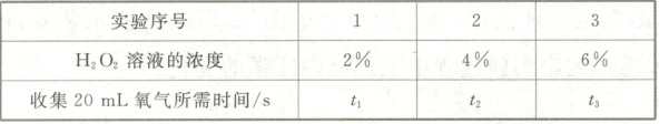 在相同条件下,分别用$30\ \mathrm{mL}$ $2\%$、$4\%$和$6\%$的$\mathrm{H_2O_2}$溶液进行实验,记录收集$20\ \mathrm{mL}$氧气所需的时间。