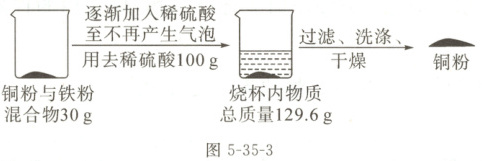 04 [陕西中考] 学习小组同学利用如图5-35-3所示实验,回收实验室废弃的铜粉与铁粉混合物中的铜粉(铁与稀硫酸反应的化学方程式为$ Fe + H_2 SO_4 \longrightarrow FeSO_4 + H_2 \uparrow$,铜不与稀硫酸反应)。