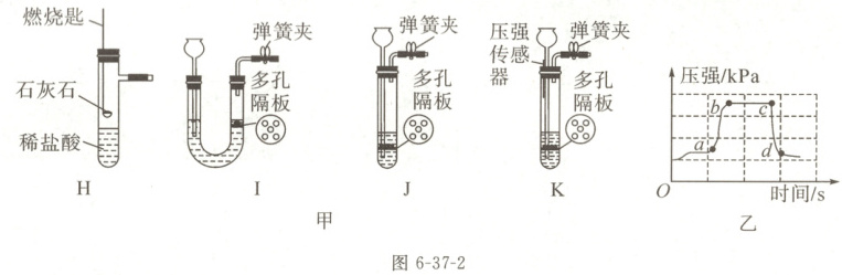 (5)通过查阅资料,化学实验小组的同学对常规实验装置进行了一些优化(如图 6-37-2 甲,夹持仪器略去)。实验室若选用装置 H 作为制取二氧化碳的发生装置,铜制燃烧匙可在试管内上下移动,此装置与将石灰石直接放入稀盐酸中相比,其主要优点是 。I、J同样具备该优点,为了解装置 I、J 具有该优点的原因,他们在装置 J 中连接压强传感器(如图 6-37-2 甲 K),从而测定实验中试管内气体压强变化的情况(如图 6-37-2乙)。下列说法正确的是 (填序号)。