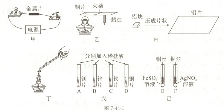 色。(2)按照图7-44-1甲所示装置进行实验,闭合开关,灯泡都发光,说明铁片、铝片、镁片、铜片具有