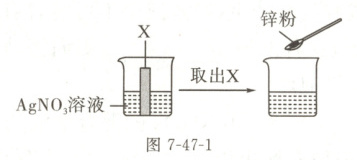 02 [陕西中考] 如图7-47-1,将金属X插入烧杯内的$ AgNO_3$溶液中,观察到溶液颜色变蓝后取出X,向烧杯内再加入一定量锌粉,振荡后,溶液蓝色逐渐消失。