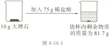 02 向$10\ g$大理石样品(大理石足量,杂质不溶于水,也不与盐酸反应)中加入一定溶质质量分数的稀盐酸,充分反应后烧杯内物质总质量变化如图8-56-1所示。