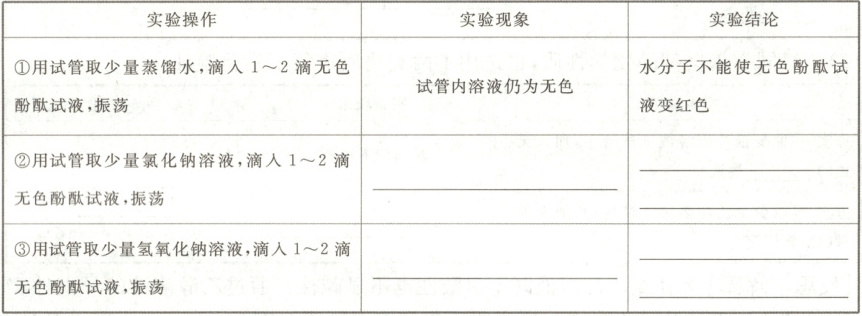 02【实验验证】试管内溶液仍为无色 $Na^{+}$不能使无色酚酞试液变红色 试管内溶液变为红色 $OH^{-}$能使无色酚酞试液变红色 【讨论反思】无色酚酞试液中本就含有水分子,已能证明水分子不能使无色酚酞试液变红色