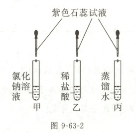 03 科学实验方案是根据特定实验目的而设计的。学习了“酸能使紫色石蕊试液变红色”的知识后,小科同学进一步了解到“盐酸能电离产生 $ H^+$ 和 $ Cl^-$,氯化钠能电离产生 $ Na^+$ 和 $ Cl^-$”。为深入研究某一问题,他设计了如图 9-63-2 所示的实验方案,请回答: