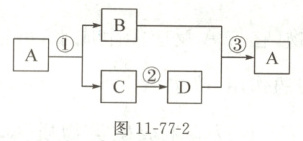 02 [河南中考] 弘扬红旗渠精神,走强国富民之路。20 世纪 60 年代,河南林县(今林州市)人民在太行山上修成了“人工天河”红旗渠。他们就地取材,利用石灰石烧制生石灰,A~D 是生石灰烧制和使用过程中涉及的部分物质,它们之间的转化关系如图 11-77-2 所示(“→”表示反应能一步实现,部分物质和反应条件已略去),其中 D 在农业生产中常用于改良酸性土壤。
