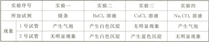 (2)实验一中,1号试管中的溶液与镁条反应产生气泡,则1号试管中为酸溶液;实验二中,向1号试管中加入氯化钡溶液后,有白色沉淀生成,说明1号试管中为稀硫酸,溶质是H₂SO₄。氢氧化钠溶液与碳酸钠不反应,而氢氧化钙与碳酸钠反应生成碳酸钙沉淀。所以四个实验中,只根据实验四的实验现象即可证明2号试管中的原溶液为氢氧化钠溶液。