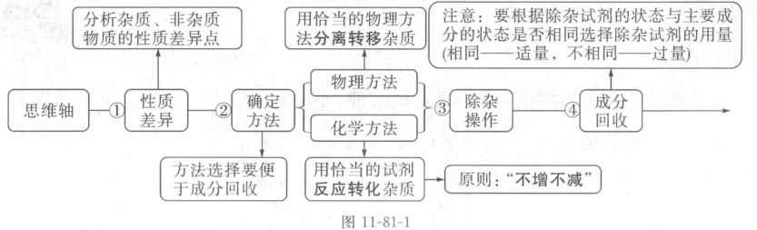 01 思维轴是按一定的方向依序构建出的思维模型,其内容包括了解决目标问题时需要经历或思考的思维过程,以及目标问题的解决方法或解决过程中的注意事项。下面是小全构建的“物质的除杂”的思维轴: