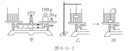 (选填“从小到大”或“从大到小”)试加砝码,并移动游码,直至天平平衡,这时右盘中的砝码和游码所在的位置如图 8-84-2 甲所示,则烧杯和水的总质量为$124$