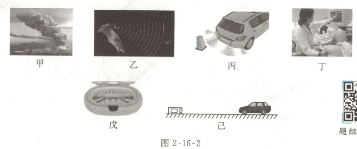 02 如图2-16-2甲、乙、丙、丁、戊、己分别是火山爆发、蝙蝠飞行、汽车倒车、B超检查、清洗眼镜、汽车测速时的情景,其中利用超声波的是图
