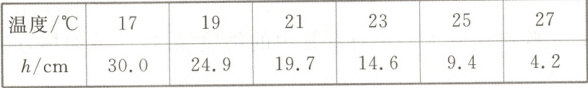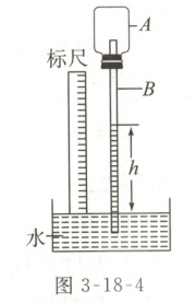 (1)受实验室温度计工作原理启发,小明同学自制了一个简易温度计,如图3-18-4,A为一塑料瓶,B为吸管,通过软木塞与A相连,管下端插入水槽中,使管内外水面有一高度差$h$,在不同温度下分别测出对应水柱高度$h$,记录数据如表: