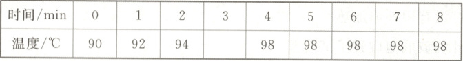 $ ° C$。若继续加热,第9 min时水的温度应为98