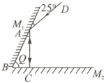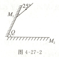02 如图 4-27-2 所示,当一束光线与平面镜$M_1$成$25^{\circ}$角入射时,要使得光线经平面镜两次反射后沿原路返回,则平面镜$M_1$与$M_2$之间的夹角$Q$应为