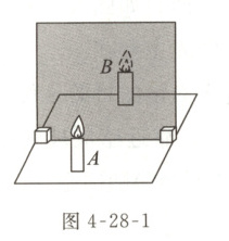 (1) 如图 4-28-1 所示,在竖立的玻璃板前点燃蜡烛 A,拿未点燃的蜡烛 B(与蜡烛 A 大小相同)竖立在玻璃板后面移动,人眼一直在玻璃板的前侧(蜡烛 A 这一侧)观察,直至蜡烛 B 与蜡烛 A 的像完全重合。此时蜡烛 B 好像也被点燃了,由此可得结论: