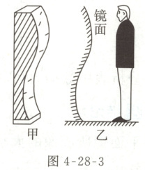 (2) 如图 4-28-3 甲所示,是由两个水平方向的柱面镜连接而成的哈哈镜,竖直置于水平地面上,当一个与哈哈镜等高的人站在其正前方时(如图乙所示),他看到的像的情况是