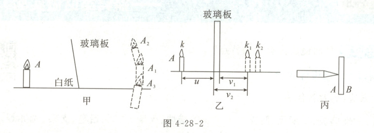 (1) 实验过程中如果玻璃板没有垂直放置在白纸上,而是如图 4-28-2 甲所示倾斜,蜡烛 A 的像应是图中的