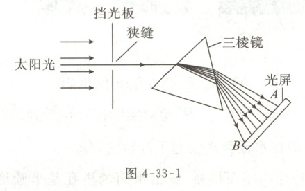 如图4-33-1所示,让一束太阳光照射到三棱镜上,通过三棱镜偏折后照射到光屏上,在光屏上出现一条彩色光带。