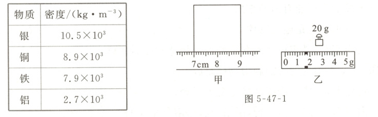 01 小雨在帮助老师整理实验室器材时,发现了一个实心正方体金属块。她想知道金属块的材质,于是用刻度尺测出它的棱长如图 5-47-1 甲所示;用托盘天平测它的质量时,右盘中所放砝码的质量和游码在标尺上的位置如图乙所示。则金属块的质量为