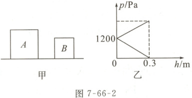 2 如图 7-66-2 甲所示,有 A、B 两个实心均匀正方体放置在水平地面上,A 的棱长为 0.4 m。将 B 沿水平方向切去厚度为$h$的部分,并将切去的部分叠放在 A 的上方中央。叠放后 A 对地面的压强与 B 剩余部分对地面的压强随切去厚度$h$变化的图像如图乙所示,则物体 B 的重力为