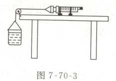 。为消除活塞与针筒间的摩擦力对实验的影响,小刚采用了如图7-70-3所示的装置,将注射器筒固定在水平桌面上,排尽注射器内的空气,用橡皮帽封住注射器的小孔,活塞通过水平细线与烧杯相连,向烧杯中缓慢加水,当活塞刚开始向左滑动时,测得杯与水的总重为$G_1$;然后从烧杯中向外缓慢抽水,当抽出水重力为$G_2$时,活塞又开始向右滑动,则活塞与注射器筒之间的摩擦力为$\frac{G₂}{2}$