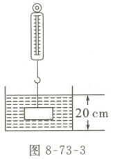 03 如图8-73-3所示,放在水平桌面上的薄壁圆柱形容器重4 N,底面积为100 cm²,弹簧测力计的挂钩上挂着重为10 N的物块,现将物块浸没在水中,容器内水面由16 cm上升到20 cm。(g取10 N/kg)求: