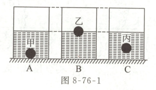 01 如图8-76-1所示,将体积相同、材料不同的重力分别为$G_{甲}$、$G_{乙}$、$G_{丙}$的甲、乙、丙三个实心均匀的小球,分别放入装有水的三个相同容器中,甲球沉底,乙球漂浮,丙球悬浮,它们受到的浮力分别为$F_{甲}$、$F_{乙}$、$F_{丙}$,则:
