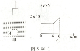 01 【全品原创】如图 8-80-1 所示,用吊机将均匀实心的正方体岩石从水面下的$A$处沿竖直方向匀速吊出水面,在整个过程中,钢缆拉力与吊起高度的关系如图乙所示,则:($\rho_{水}=1 × 10^{3} kg/m^3$,$g$取$10 N/kg$)