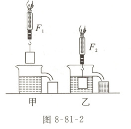 02 【全品原创】放在水平桌面上的溢水杯盛满水,用测力计挂一个均匀实心铁块,示数为$F_1$,如图 8-81-2 甲所示,将铁块缓慢浸没在水中(未接触溢水杯),溢出的水流入小烧杯,测力计的示数为$F_2$,如图乙所示,则: