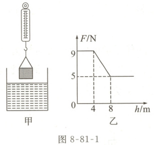 01 【全品原创】如图 8-81-1 所示,将一个均匀实心的长方体物体匀速竖直地逐渐浸入水中,图乙是弹簧测力计示数$F$与物体下降高度$h$变化的关系图像,则:($g$取$10 N/kg$)