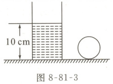 03 如图 8-81-3 所示,有一底面积为$50 cm^2$,高为$15 cm$,质量为$100 g$的平底圆柱形薄壁容器,将一个质量为$250 g$,体积为$200 cm^3$的均匀实心小球置于水平桌面上,放入小球之前容器内水的深度为$10 cm$,然后将小球轻轻放入水中,待其静止。则:($g$取$10 N/kg$)