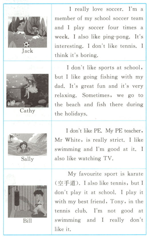 5. C [解析] 推理判断题。由表格第一栏中的“I don’t like tennis. I think it’s boring.”可知,杰克不喜欢打网球,故选项A不正确;由表格第二栏中的“I don’t like sports at school, but I like going fishing with my dad.”可知,凯茜在学校不喜欢做运动,故选项B不正确;由表格第三栏中的“I don’t like PE. My PE teacher, Mr White, is really strict.”可知,萨莉认为她的体育老师太严格了,故判断她不喜欢她的体育老师,故选项C正确;由表格第四栏中的“My favourite sport is karate(空手道).”可知,比尔喜欢空手道,并不是太极拳,故选项D不正确。故选C。