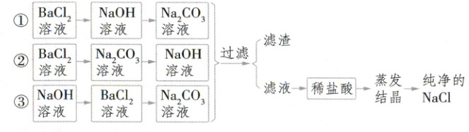 ②$BaCl_2$溶液$\to$$Na_2CO_3$溶液$\to$$NaOH$溶液$\xrightarrow{过滤}$$\begin{cases} 滤渣 \\ 滤液 \end{cases}$$\xrightarrow{稀盐酸}$$\xrightarrow{蒸发}$$\xrightarrow{结晶}$纯净的$NaCl$