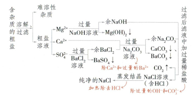 含杂质的粗盐$\xrightarrow{溶解、过滤}\begin{cases} 难溶性杂质 \\ 粗盐溶液\begin{cases} Mg^{2+} \xrightarrow{过量NaOH溶液} \begin{cases} 余NaOH \\ Mg(OH)_2 \downarrow \end{cases} \\ Ca^{2+} \\ SO_4^{2-} \xrightarrow{过量BaCl_2溶液} \begin{cases} 余BaCl_2 \\ BaSO_4 \downarrow \end{cases} \end{cases} \xrightarrow{过量Na_2CO_3溶液(除Ca^{2+}和过量的Ba^{2+})} \begin{cases} 余Na_2CO_3 \\ CaCO_3 \downarrow、BaCO_3 \downarrow \end{cases} \end{cases}$$\xrightarrow{过滤}$滤液$\xrightarrow{中加过量稀盐酸}$$\begin{cases} CO_2 \uparrow \\ NaCl溶液(含HCl) \end{cases}$$\xrightarrow{蒸发结晶}$纯净的$NaCl$$\xleftarrow{加热除去HCl}$