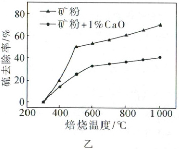 (2)添加1%CaO和不添加CaO的矿粉焙烧,其硫去除率随温度变化曲线如图乙所示。