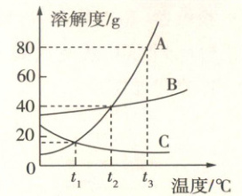 D.将$t_2^{\circ}C$时 C 物质的饱和溶液升温到$t_3^{\circ}C$,溶质的质量不变