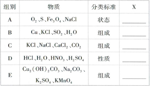 下列五组物质中均有一种物质X,按如表所示的分类标准,其类别与其他三种物质不同。