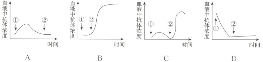 16. 病毒性脑炎患者痊愈后,在一段时间内不会再患此病。图中能正确解释此现象的曲线(①表示首次感染,②表示再次感染)是(