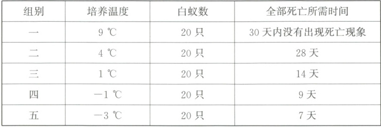 32. (4分)白蚁是一种常见的害虫。有人为了研究温度对白蚁存活状态的影响,将白蚁分成五组,在不同温度下饲养(其他条件相同),并记录了各组白蚁全部死亡所需的天数,结果如下表所示,分析并回答问题。