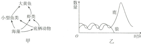 。(5) 图乙中,开始一段时间内,两种动物的数量和所占比例处于相对稳定的状态。后期由于人类过度捕杀狼,鹿的数量先大增,之后又连续减少,生态系统的稳定性被破坏,这说明生态系统的